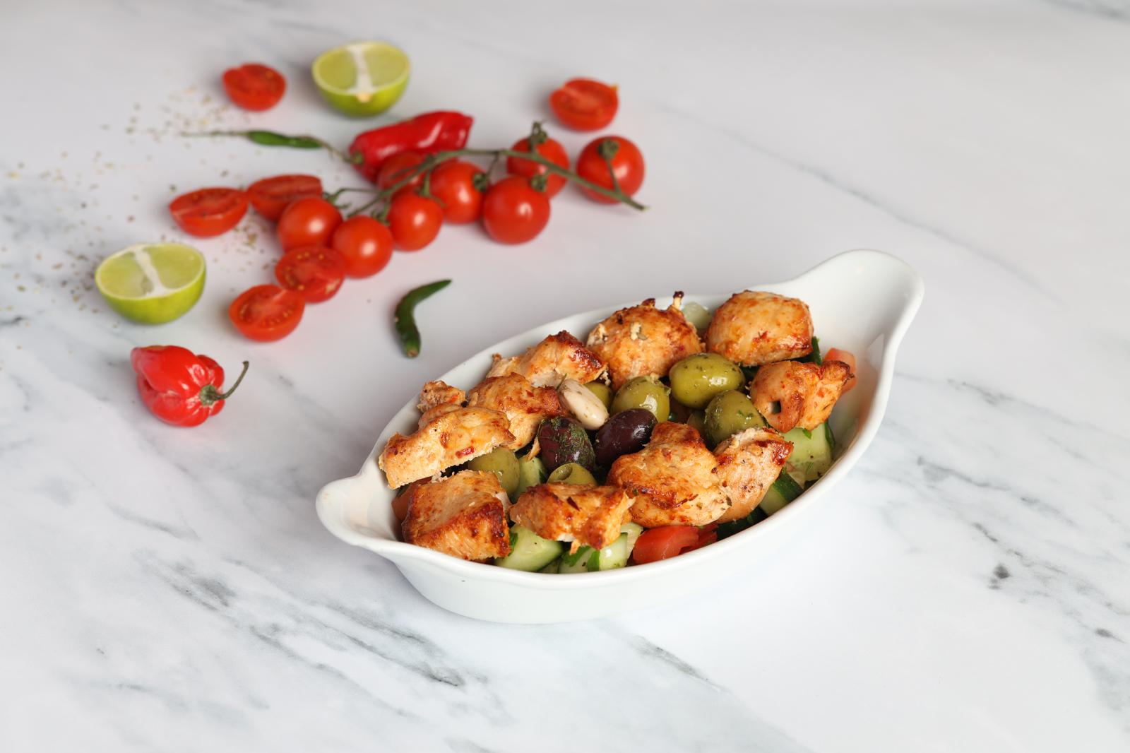 Skewer of chicken shish, lettuce, cucumber, tomato, olives.